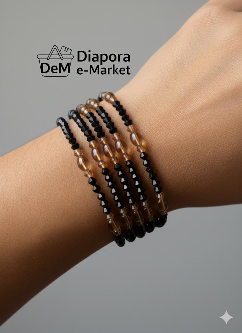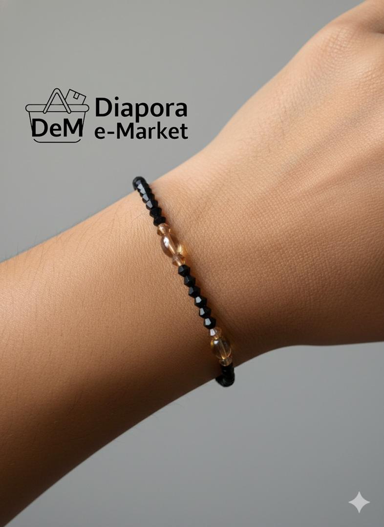 * Perles d’Accent : Le bracelet est agrémenté de trois perles d’accent plus grandes, de forme ovale. Ces perles sont de couleur dorée/ambrée translucide ou fumée.