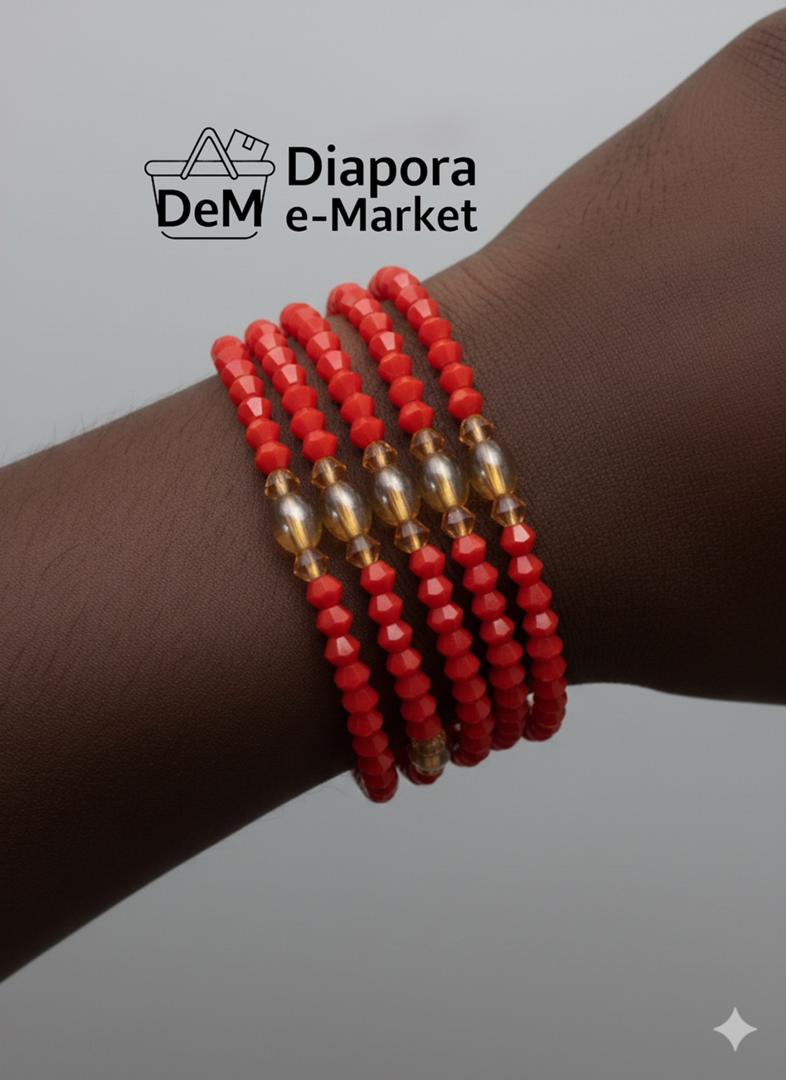 * Design : Le bracelet est composé principalement de petites perles à facettes de couleur rouge corail ou rouge orangé, formant un cercle continu.