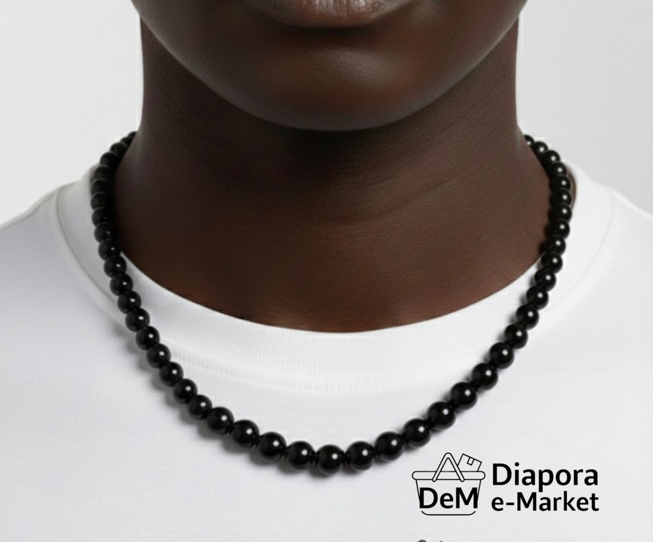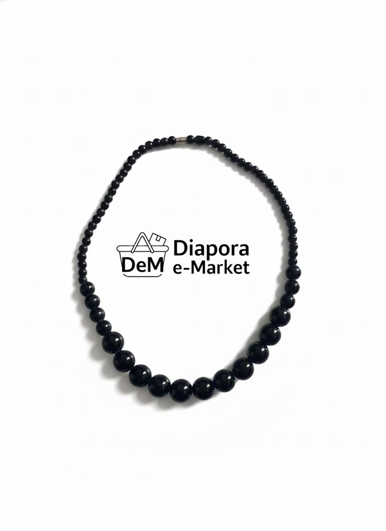 * Design : Ce collier est composé d’une série de perles rondes et lisses, d’un noir profond et lustré. Les perles sont uniformément enfilées pour créer une silhouette classique et raffinée.
