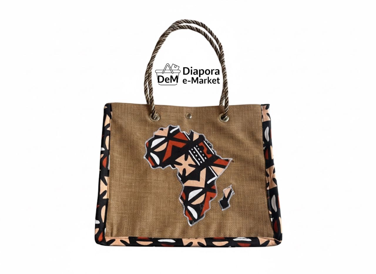 * Motif Central Impactant : Le sac est orné d’une grande silhouette du continent africain en appliqué, réalisée dans un tissu à motifs géométriques noir et blanc. Ce design audacieux est un véritable hommage à l’identité et à la beauté africaines.